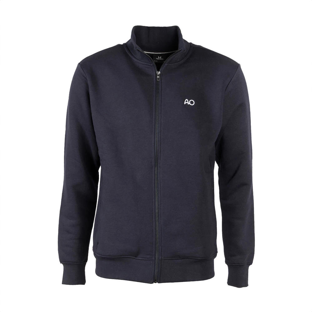 Full zip cardigan with long sleeves  and ribbed raised collar, brushed heavyweight sweatshirt material, double stitched elastic cuffs, two front pockets with zippers.